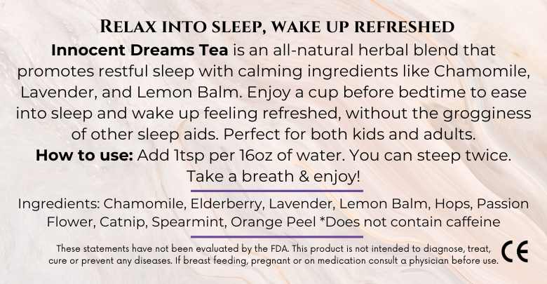Innocent Dreams Tea is an all-natural herbal blend composed of soothing and calming ingredients that work together to promote restful sleep. This unique blend contains Chamomile, Elderberry, Lavender, Lemon Balm, Hops, Passion Flower, Catnip, Spearmint and Orange Peel which are known for their calming properties. Enjoy a cup of Innocent Dreams Tea before bedtime to help ease into sleep, wake up feeling clear and energized without the grogginess associated with other sleep aids. This tea is suitable for kids and adults alike so you can enjoy a restful night's sleep and start your day with a refreshed mind.