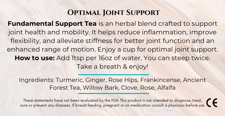 Fundamental Support Tea is a unique herbal blend designed to provide natural support for joint health and mobility. This special combination of herbs includes Turmeric, Ginger, Rose Hips, Frankincense, Ancient Forest Tea, Willow Bark, Clove, Rose, and Alfalfa. The combination of these powerful ingredients helps to reduce inflammation in the joints, improve joint flexibility and reduce stiffness. Enjoy a cup of Fundamental Support Tea for optimal joint health and an enhanced range of motion.